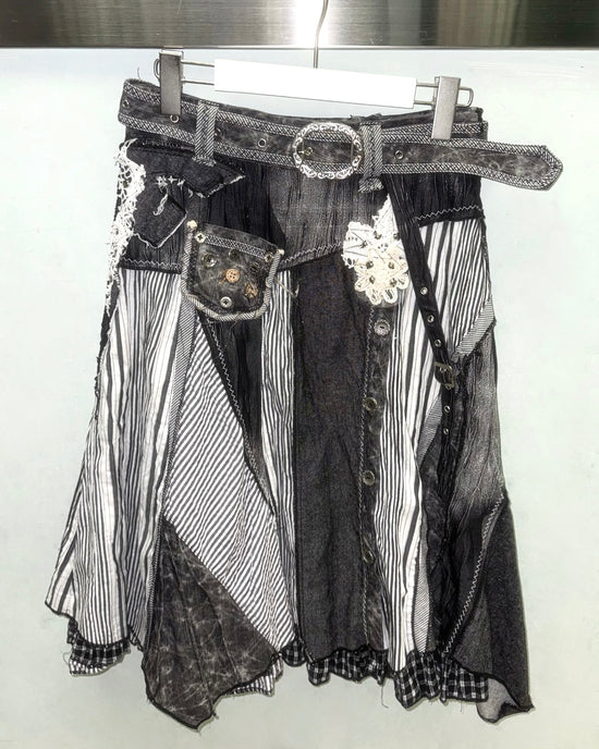 Denim embroidered patchwork skirt with belt